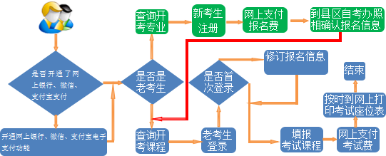 1.新生首次报考,须使用身份证号登陆网站进行注册报名,填写本人自然信息和手机号、选择照相地点(即报名地点)、支付电子注册费后,到当地自考办确定的报名点进行现场照相。现场照相确认后,考生使用准考证号登陆网站,选择考试地点,填报课程,在线支付报考费用,在规定时间内完成报考过程。
