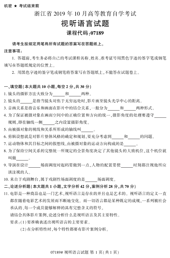 • 所在位置:甘肃自考网 > 自考试卷 > 2019年10月份全国自考《视听语言》 考试真题
