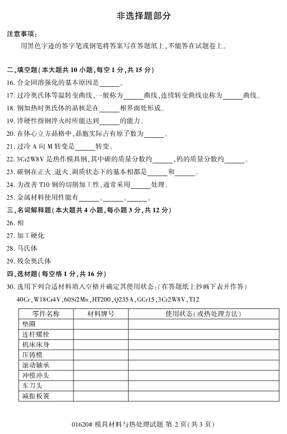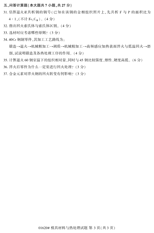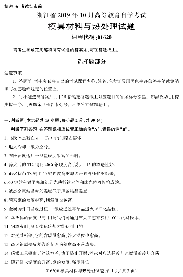 2019年10月份全国自考《模具材料与热处理》 考试真题
