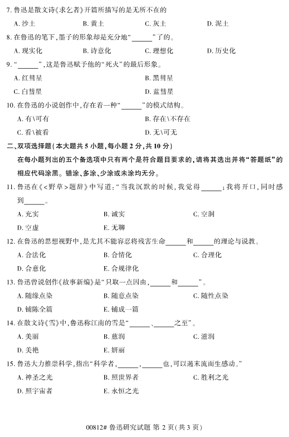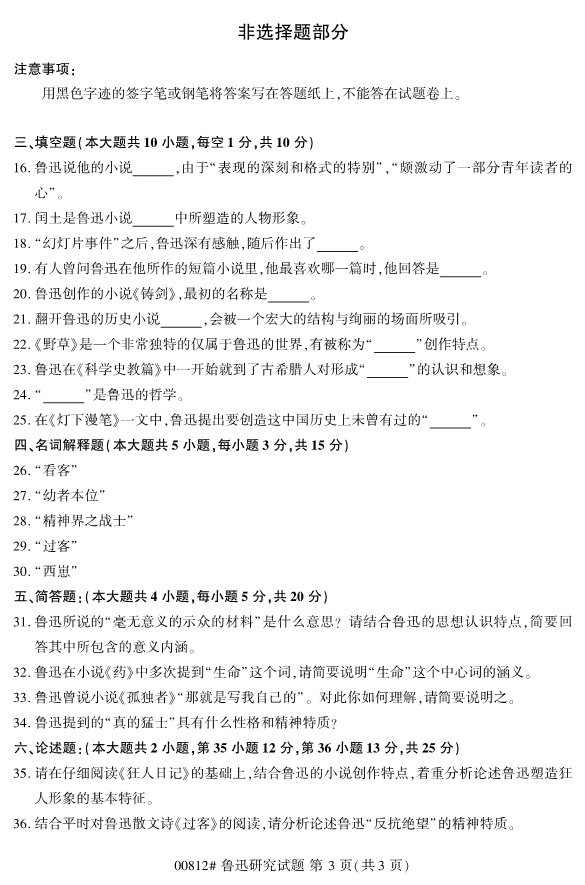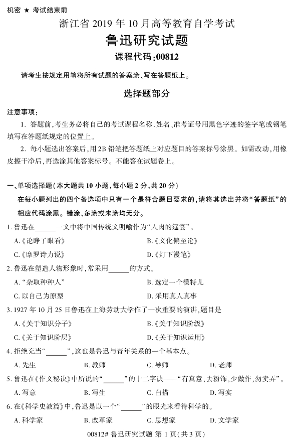 • 所在位置:甘肃自考网 > 自考试卷 > 2019年10月份全国自考《鲁迅研究》 考试真题