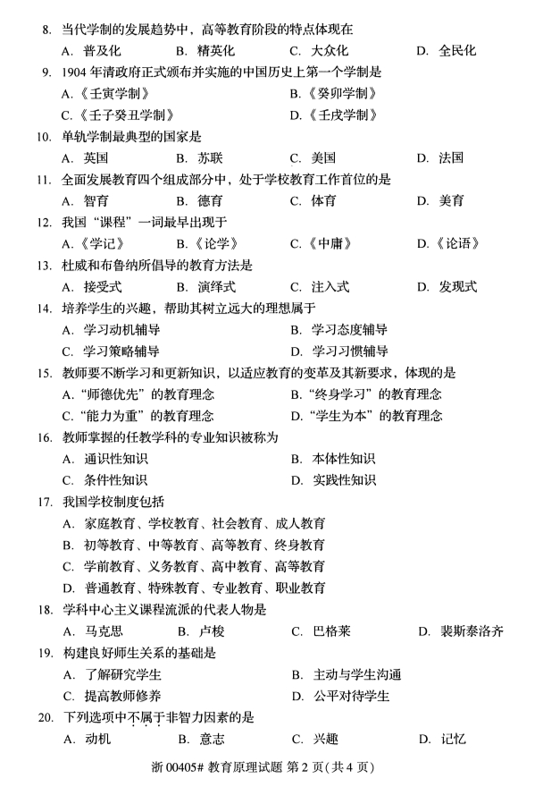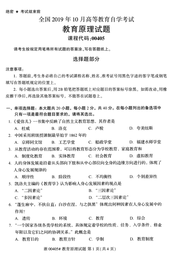 • 所在位置:甘肃自考网 > 自考试卷 > 2019年10月份全国自考《教育原理》 考试真题