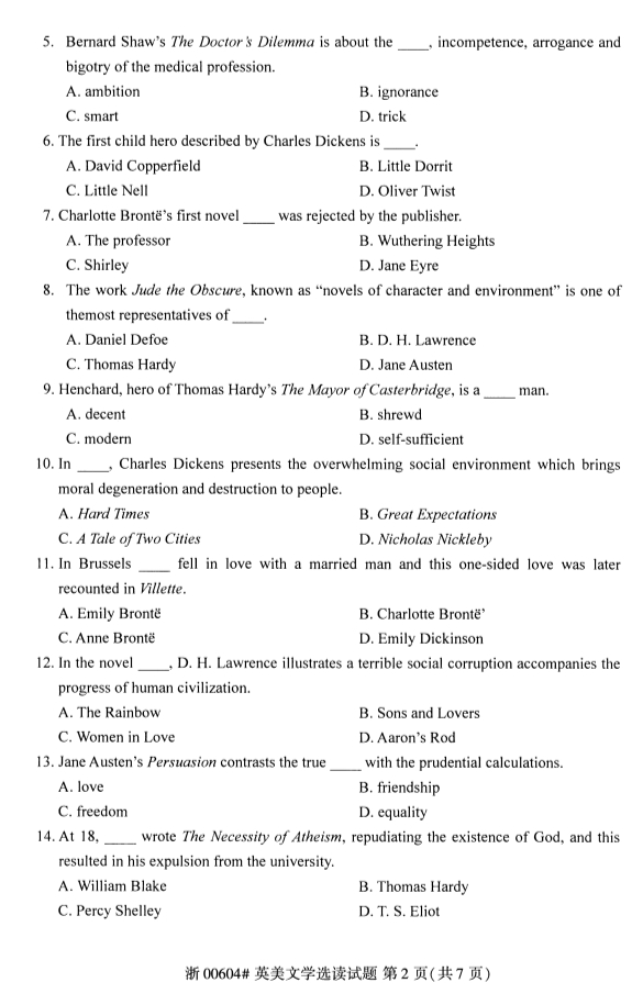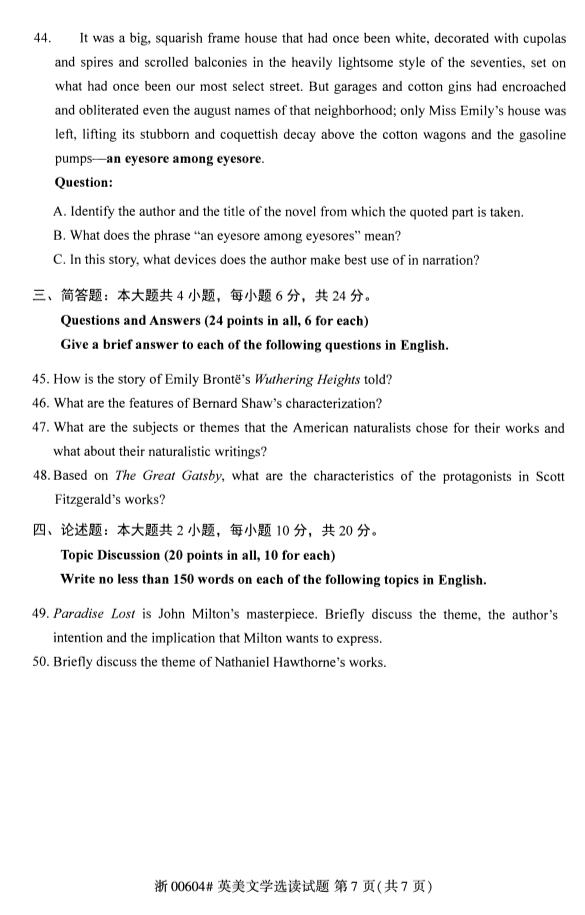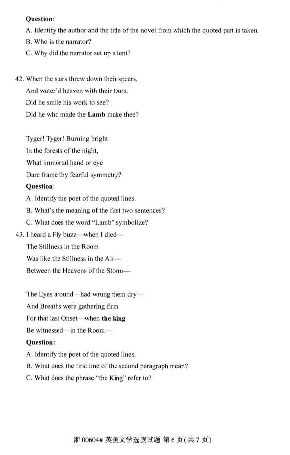 2020年8月甘肃自考英美文学选读真题