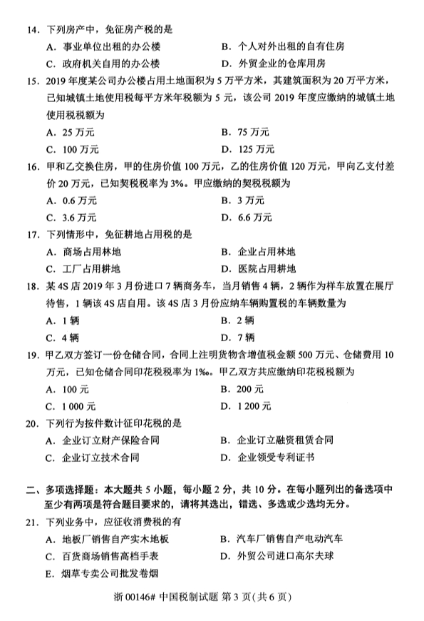 甘肃自考中国税制真题