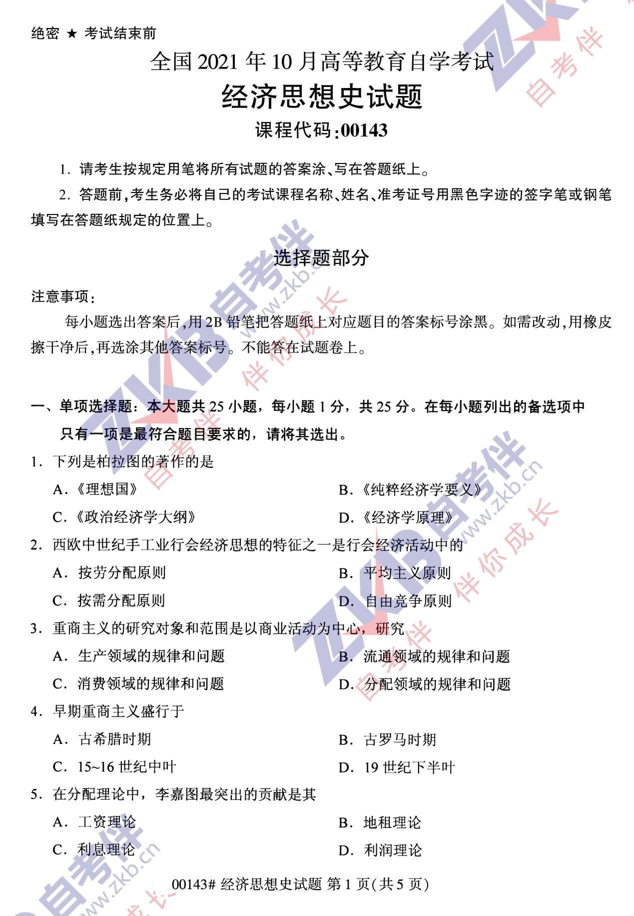 2021年10月甘肃00143经济思想史真题